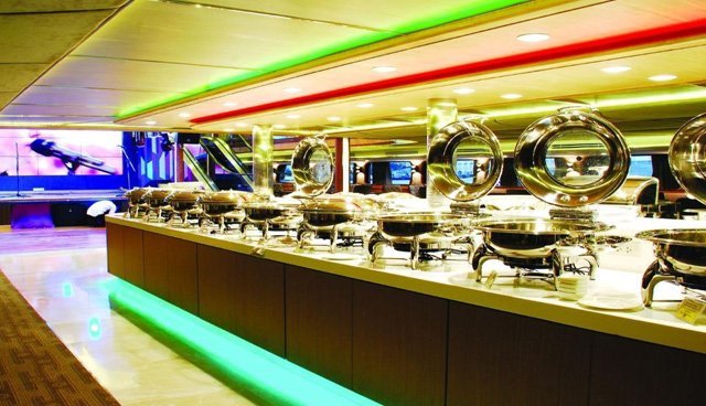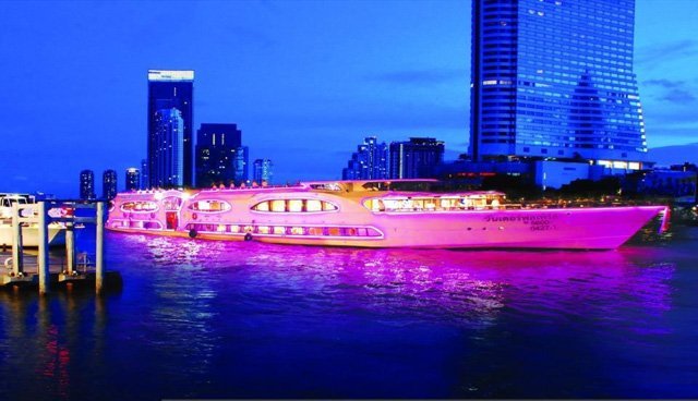 Nikmati juga makan malam buffet di atas kapal modern yang luas. Setelah check in di Dermaga River City Bangkok, anda akan memulai petualangan untuk melihat beberapa obyek wisata kota yang paling terkenal, tentunya dari sudut padang yang unik. Kapal ini menyuguhkan pemandangan cantik karena dihiasi oleh lampu-lampu. Baik ketika berlayar maupun saat masih di dermaga, anda memiliki banyak kesempatan untuk berforto dengan kapal. Dengan cekatan, kapten akan mengarahkan kapal melewati Wat Arun, Grand Palace dan obyek wisata lain. Anda memiliki banyak waktu untuk mengambil foto dan menyerap lanskap cakrawala yang indah. Pukul 20:00, makan malam akan disajikan, menunya berupa hidangan Thailand dan masakan internasional.